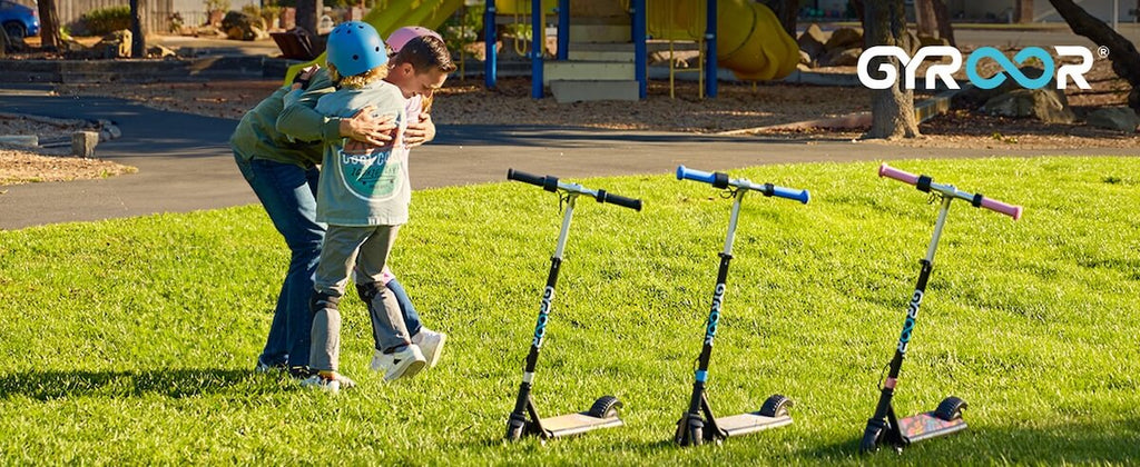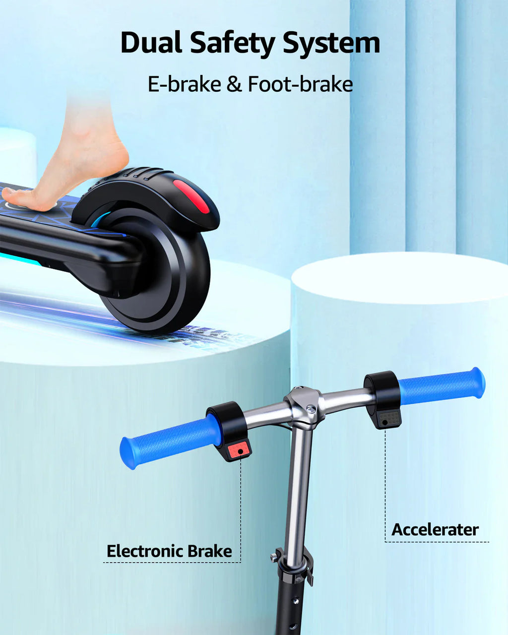 Designed for fun and safety, this scooter features flashing LED lights, an adjustable handlebar, and a dual brake system for peace of mind. Lightweight, portable, and stylish, the Gyroor ESA is the perfect blue kids scooter for outdoor adventures.